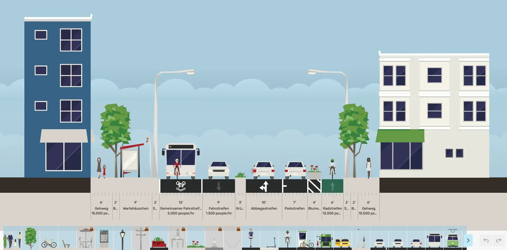 Streetmix ist ein interaktives Online-Tool, mit dem du den Straßenquerschnitt deiner eigenen Straße entwerfen kannst: Du schiebst Elemente per Drag & Drop an die richtige Stelle, passt Breiten an und teilst dein Ergebnis.